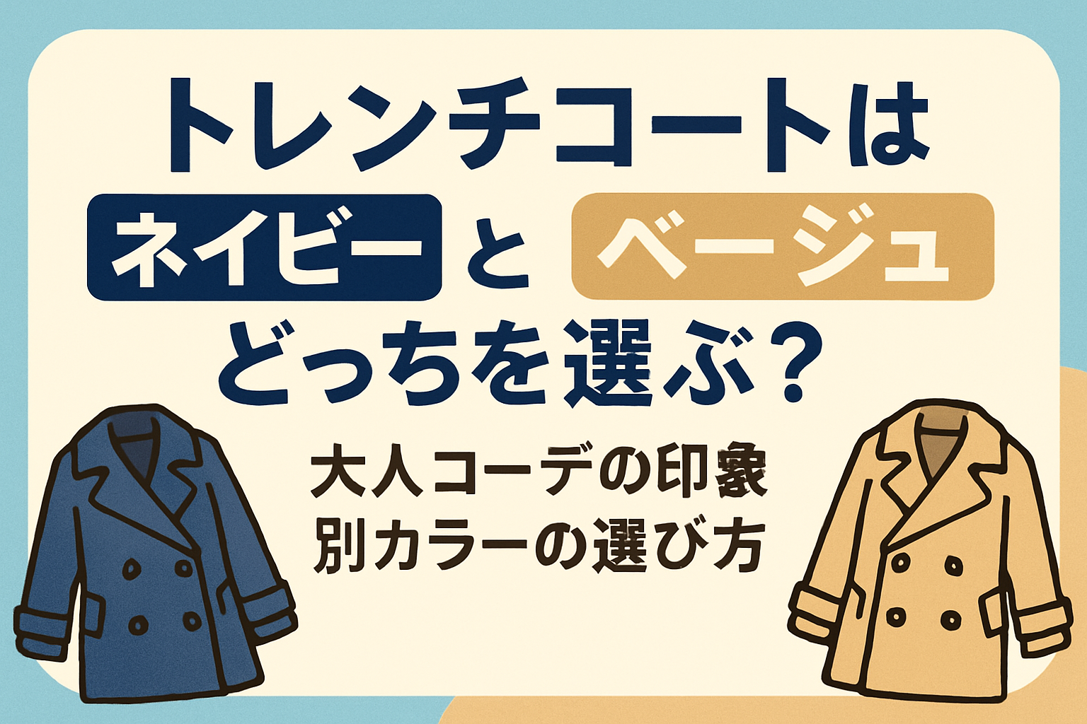 「トレンチコートはネイビーとベージュどっちがいいんだろう?」「初めて買う1着、失敗したくない…」そんなふうに迷って、このページにたどりついた人も多いと思います。トレンチコートは、ベーシックで長く使いやすい定番アウターです。その中でもネイビー...